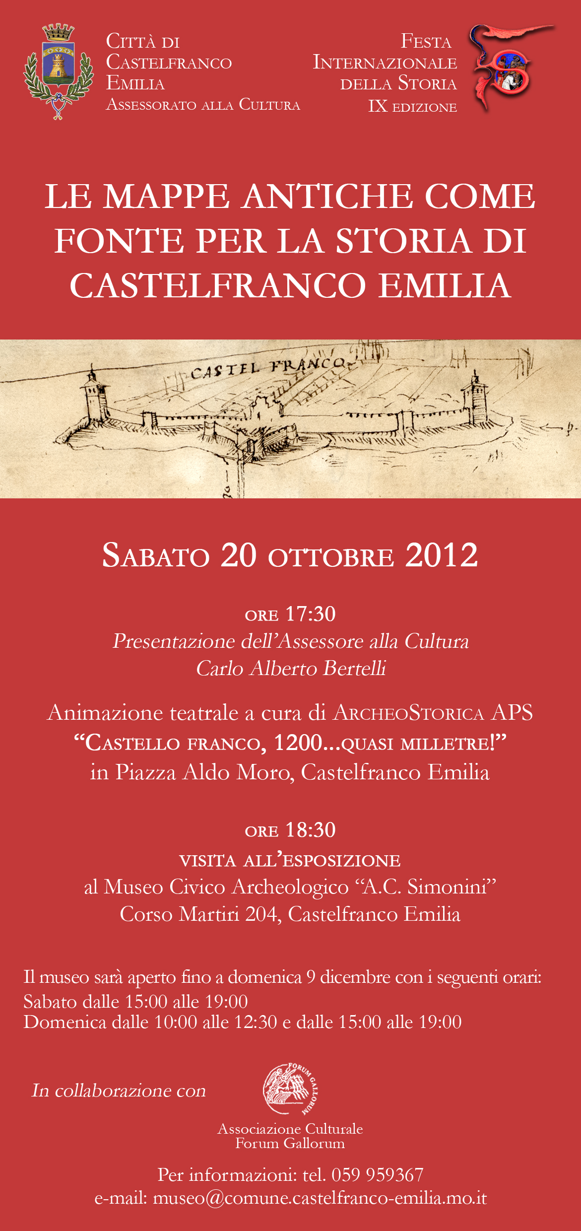 Sabato 20 ottobre, in occasione della apertura dell'esposizione "Le mappe antiche come fonte per la storia di Castelfranco Emilia", presso il Museo Civico Archeologico "A.C. Simonini" di Castelfranco Emilia, l'associazione ArcheoStorica proporrą un'animazione teatrale dal titolo